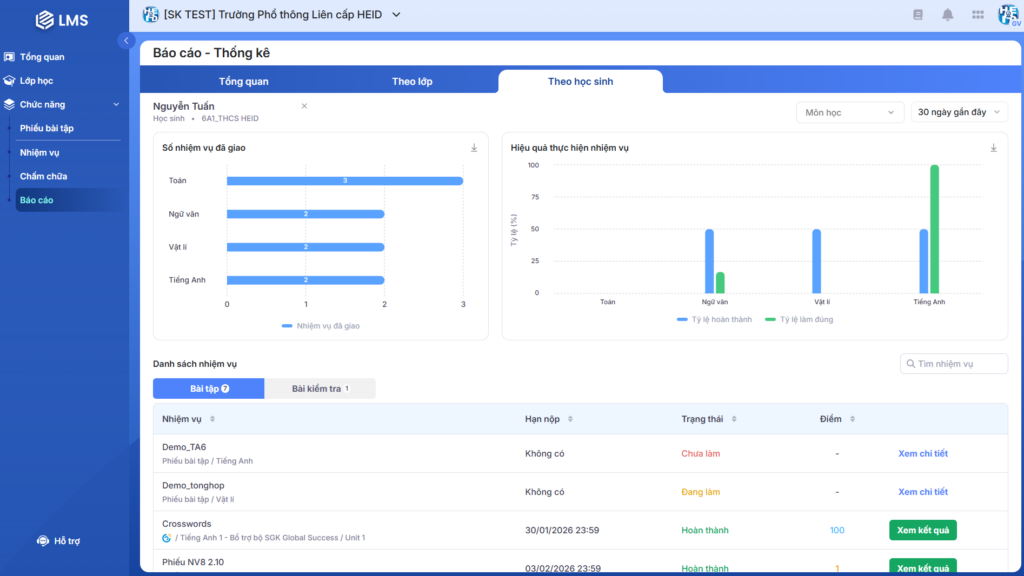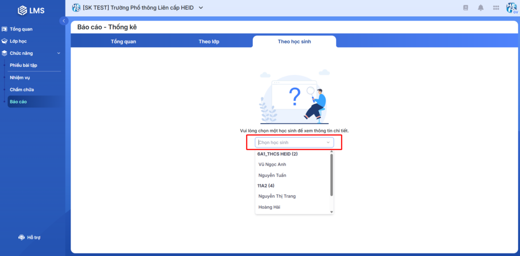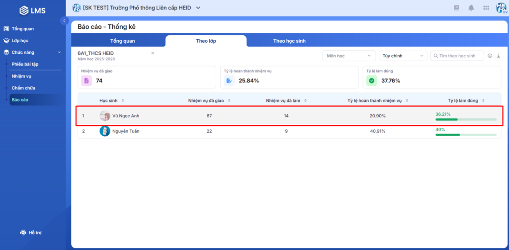 Hình 1: Màn hình Theo học sinh của Báo cáo – Thống kê