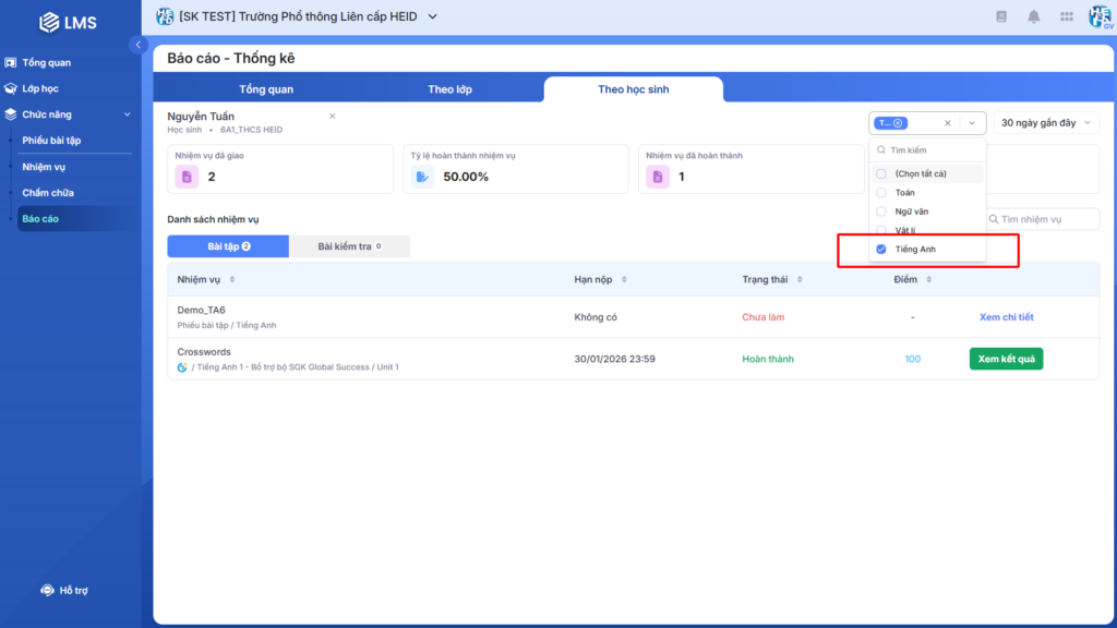 Bước 2: Giáo viên chọn vào từng học sinh để xem chi tiết báo cáo.