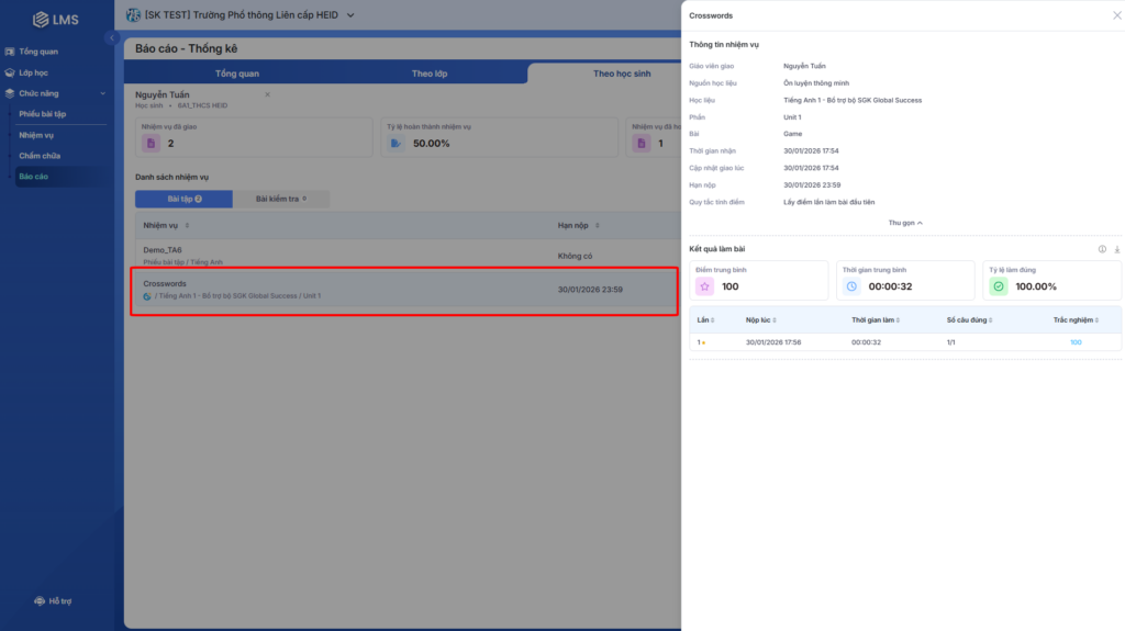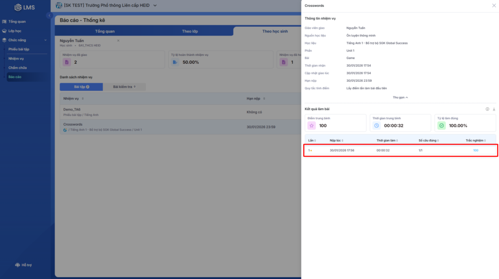 Bước 1: Tại màn hình báo cáo, giáo viên chọn vào tên nhiệm vụ để xem thông tin chi tiết và kết quả làm bài.