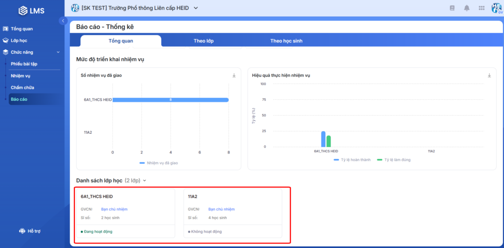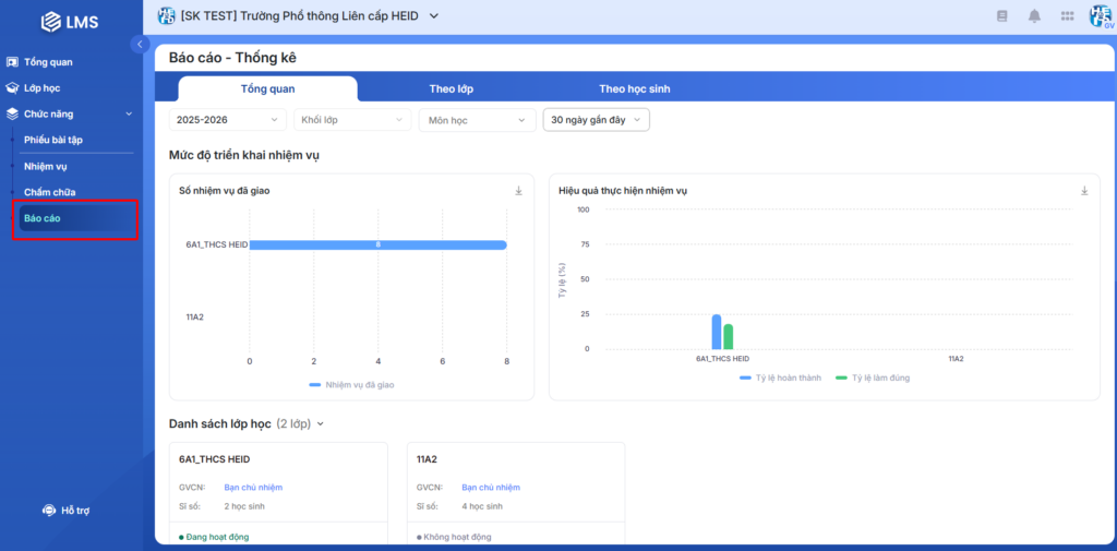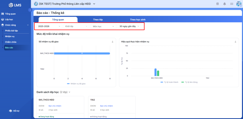 - Trang Báo cáo – Tổng quan của LMS giúp giáo viên có thể nắm bắt tình hình chung của từng lớp theo thời gian cụ thể.
