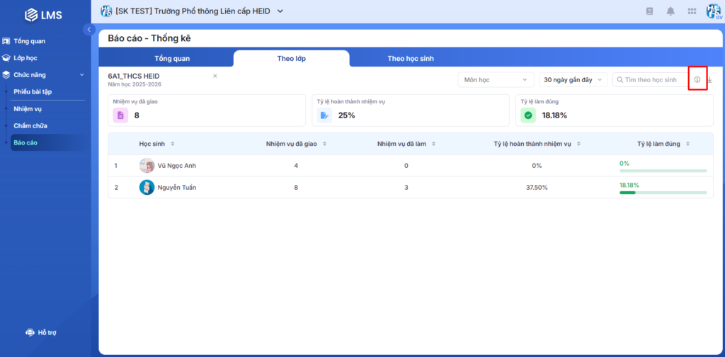 - Tỷ lệ hoàn thành nhiệm vụ (Thể hiện mức độ hoàn thành nhiệm vụ của học sinh trong lớp).