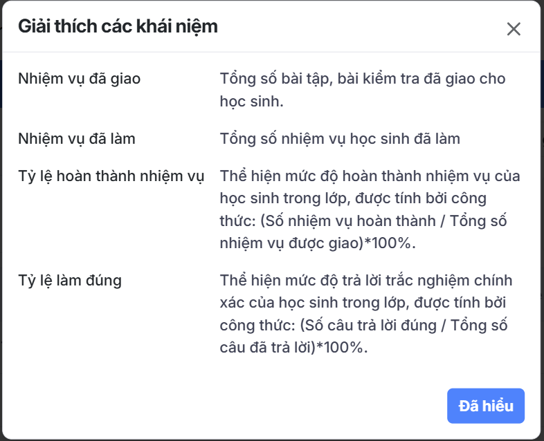 - Tỷ lệ hoàn thành (Thể hiện mức độ hoàn thành nhiệm vụ của học sinh).