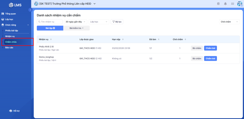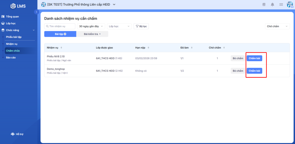 Bước 2: Tại màn Danh sách nhiệm vụ cần chấm, giáo viên chọn Chấm bài