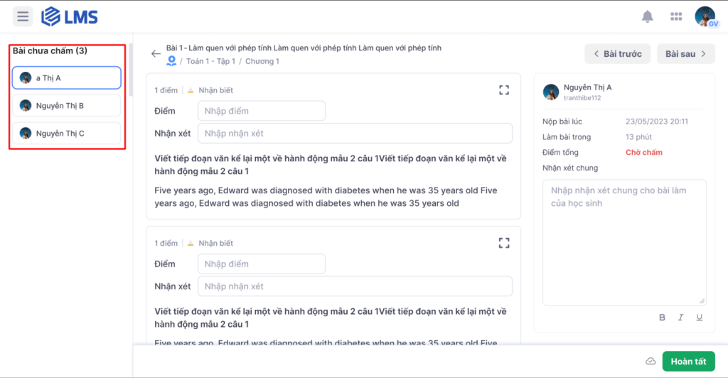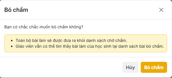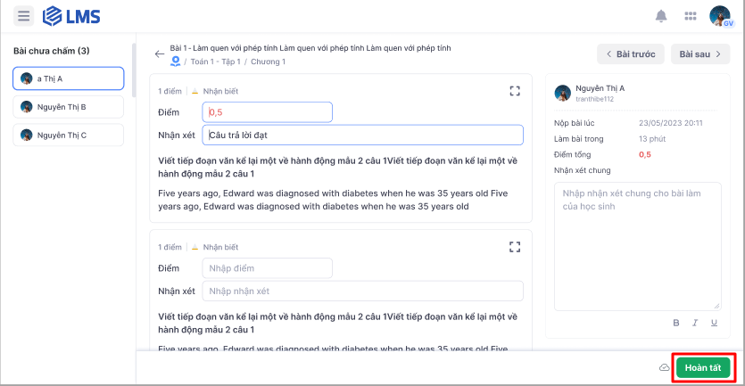 Lưu ý: Thầy/cô cần chấm tất cả các bài làm đã nộp của học sinh để hoàn tất chấm bài.