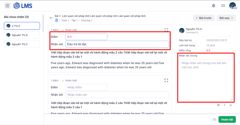Bước 2.2: Giáo viên thực hiện chấm bài của học sinh bằng cách nhập vào ô Điểm, Nhận xét và Nhận xét chung