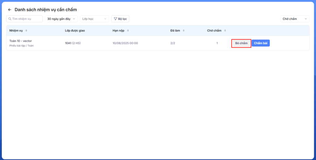 Bước 3: Giáo viên có thể chọn Bỏ chấm tại màn Danh sách nhiệm vụ cần chấm.
