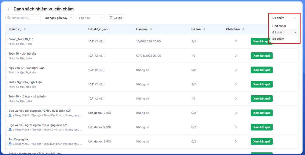 Bước 4: Tại màn Danh sách nhiệm vụ cần chấm, giáo viên có thể xem danh sách các nhiệm vụ Chờ chấm, Đã chấm, Bỏ chấm.