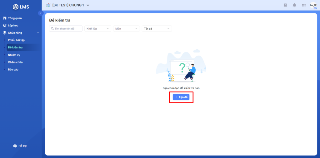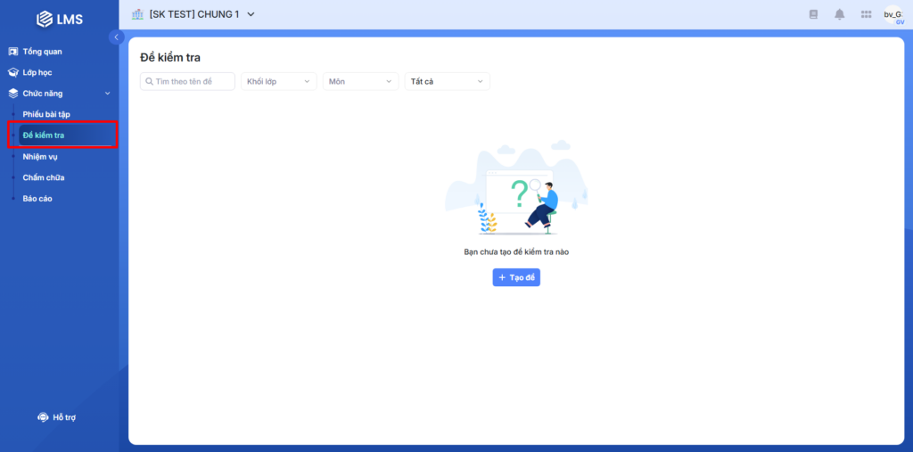 Bước 2: Tại màn hình Đề kiểm tra, giáo viên chọn Tạo đề để tạo đề kiểm tra mới