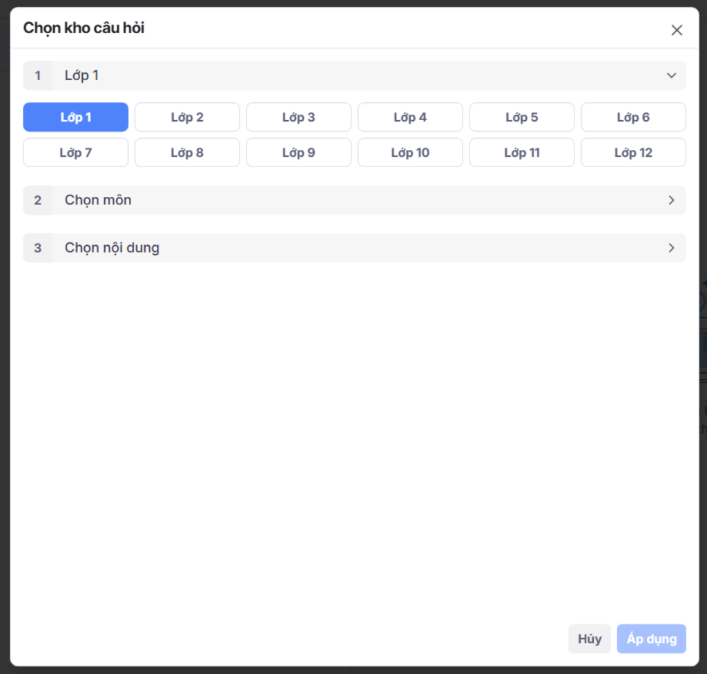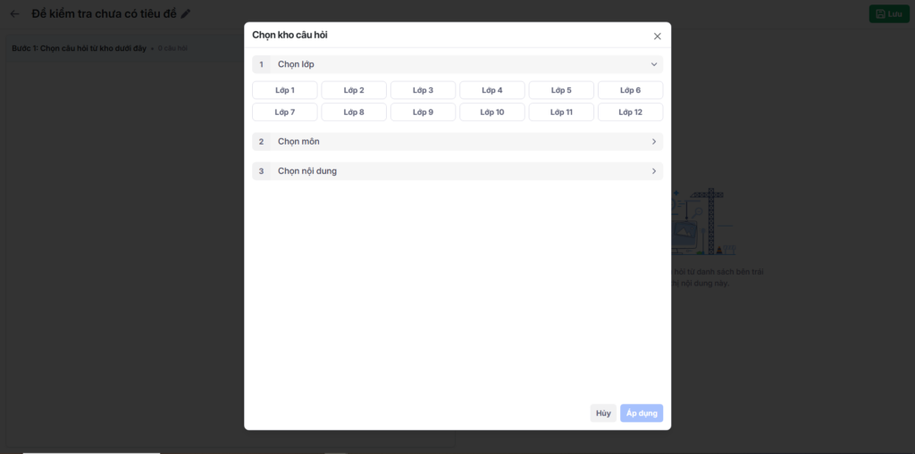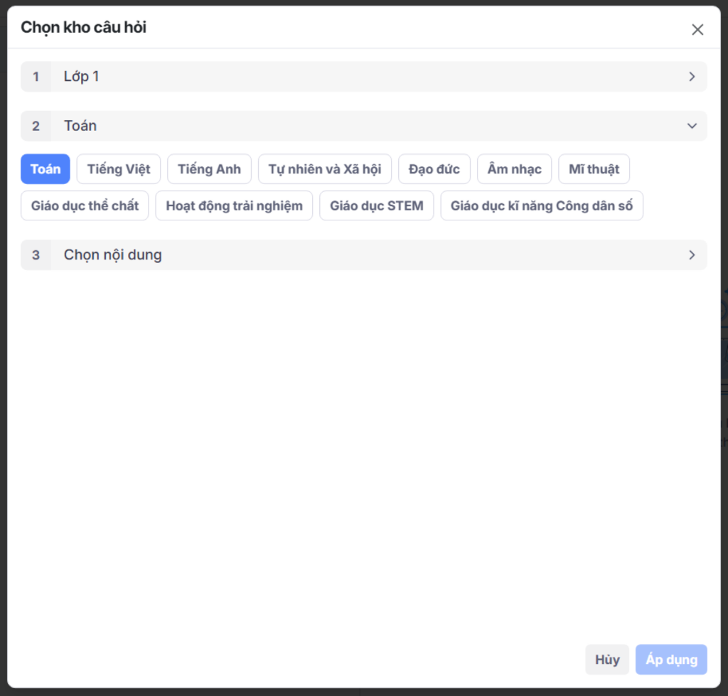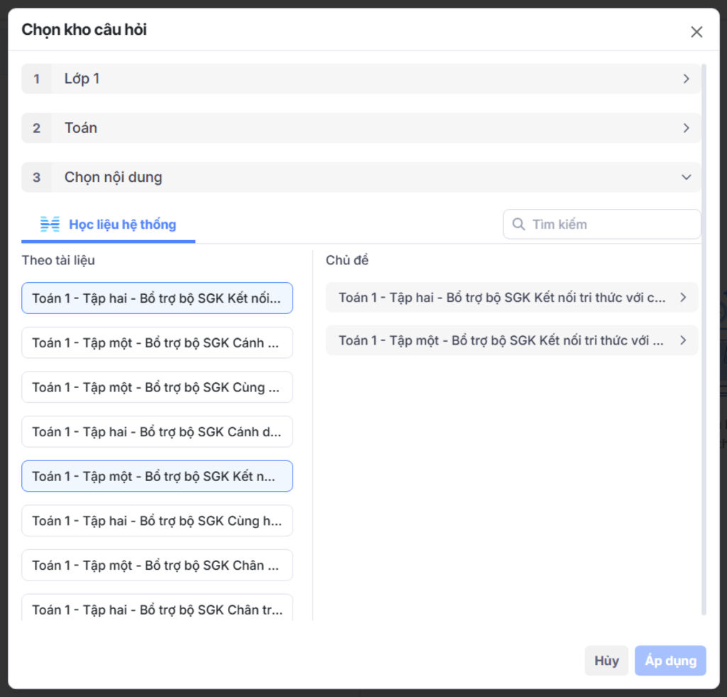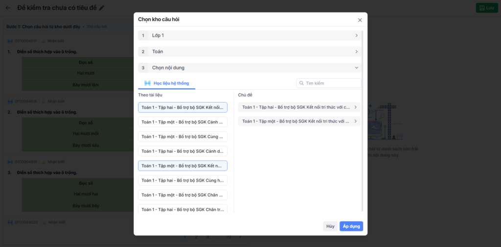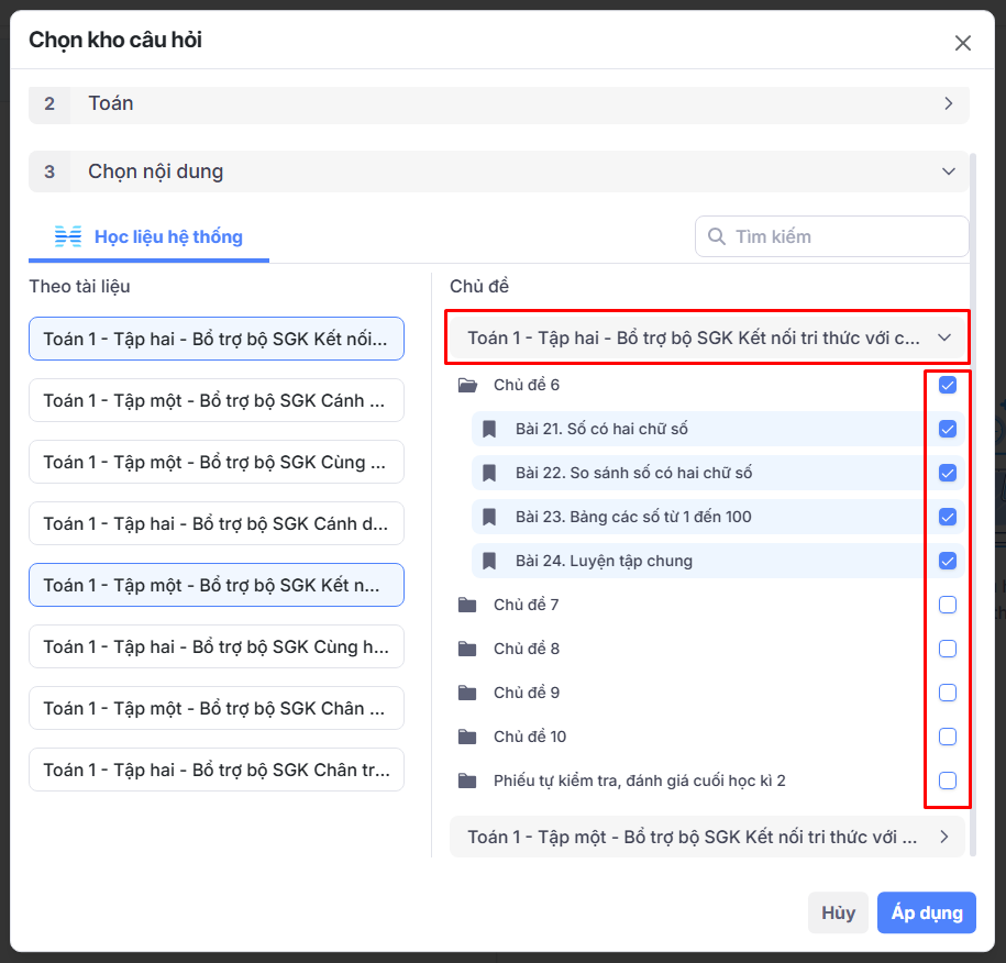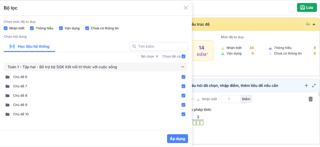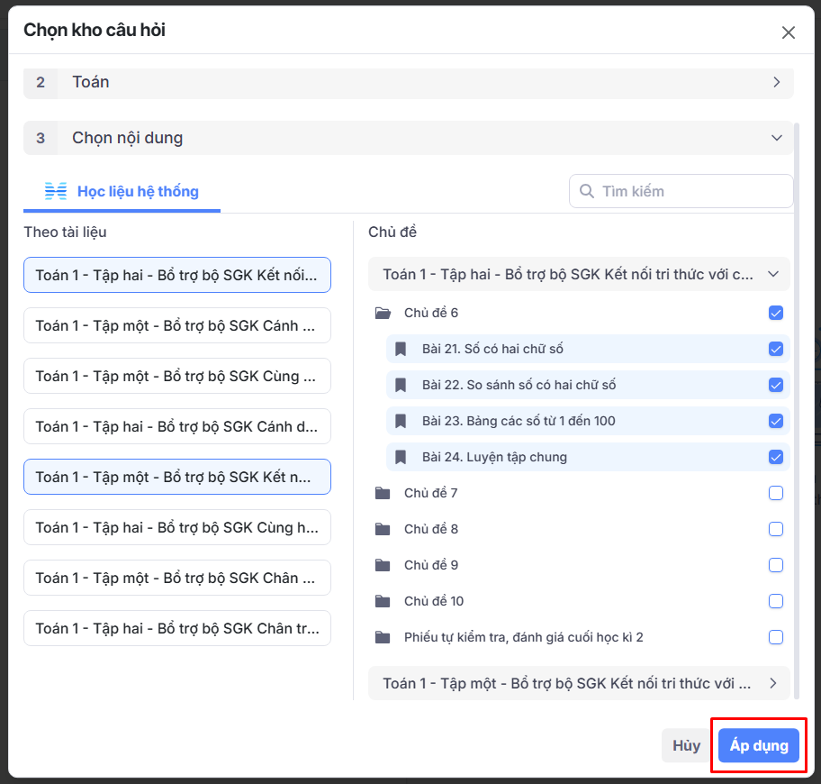 Bước 2.1.5: Sau khi hoàn tất chọn nội dung, giáo viên chọn Áp dụng để hoàn tất chọn kho câu hỏi.