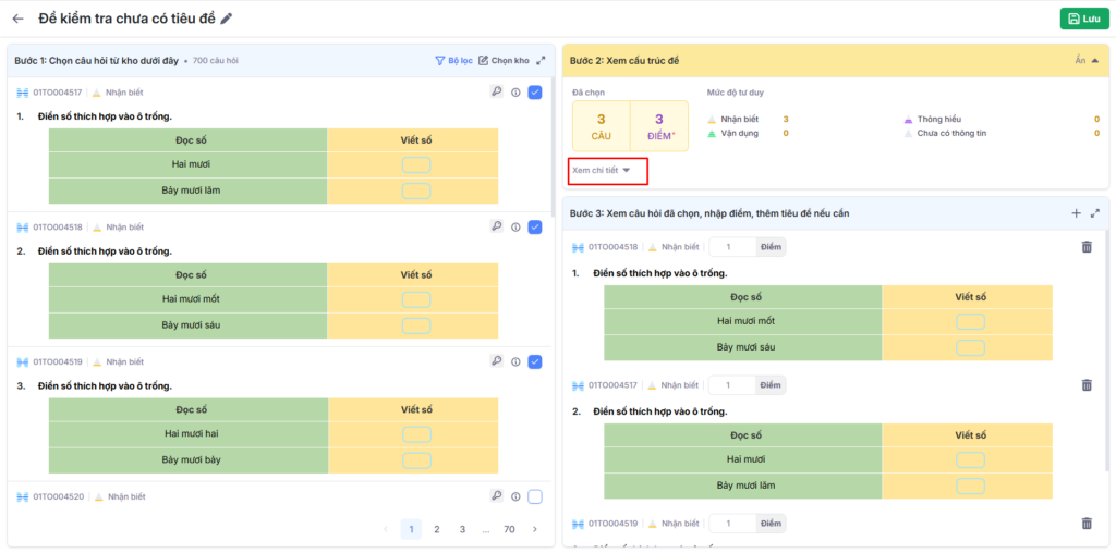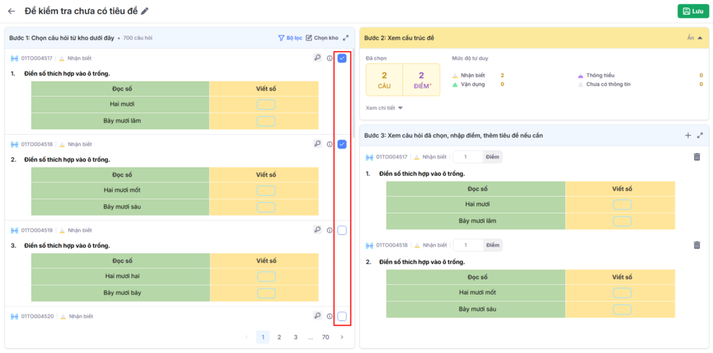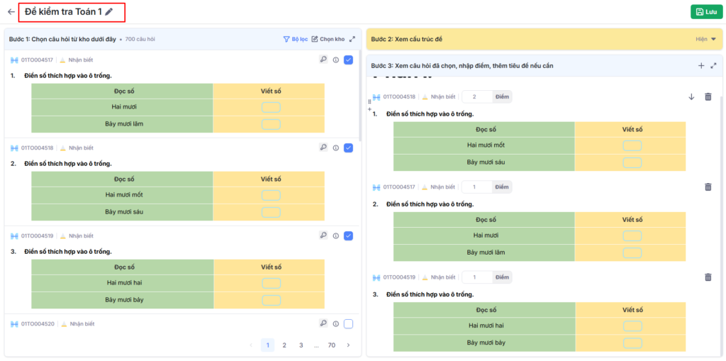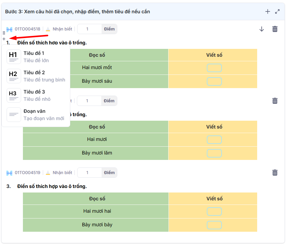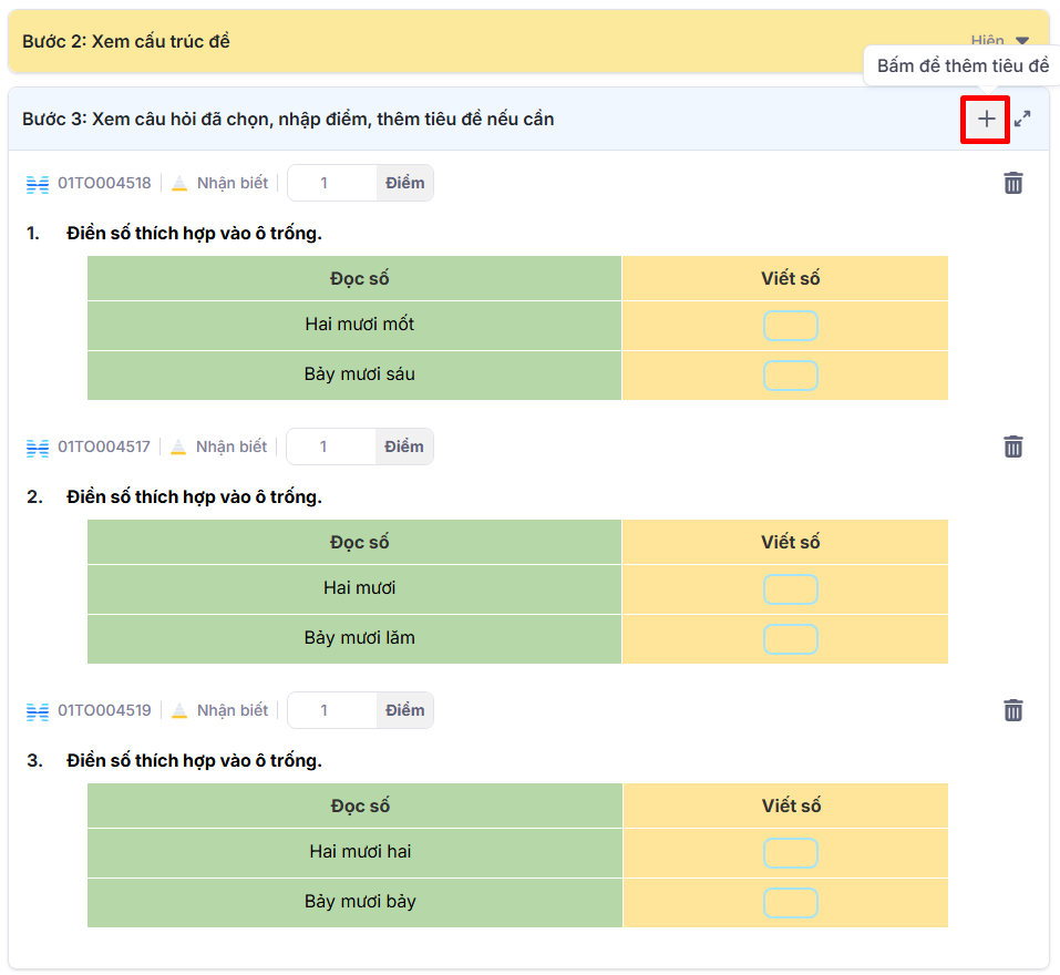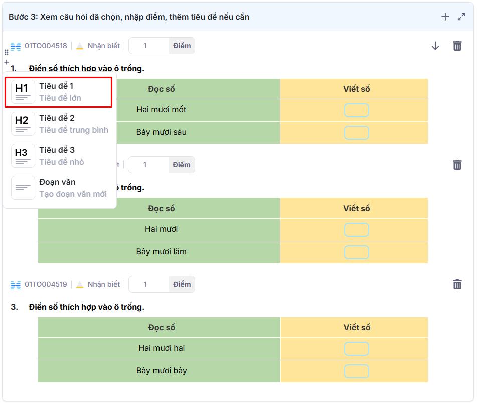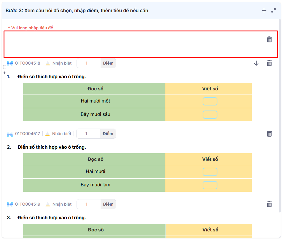 Bước 2.4: Từ danh sách câu hỏi đã chọn, giáo viên có thể Tạo tiêu đề