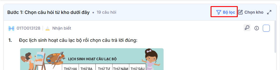 Để điều chỉnh danh sách câu hỏi hiển thị tại bước 1, giáo viên thực hiện một trong các thao tác sau: