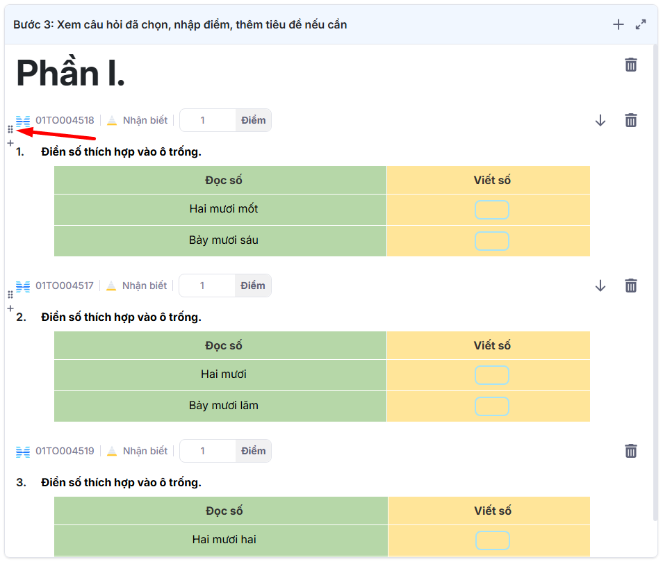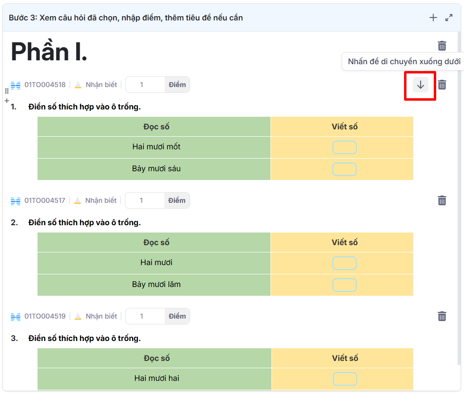 Bước 2.5: Giáo viên di chuyển thứ tự các câu hỏi
