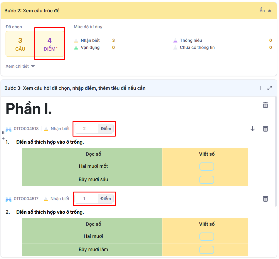 Giáo viên có thể chỉnh sửa điểm của từng câu hỏi và xem lại tổng điểm ở Cấu trúc đề.