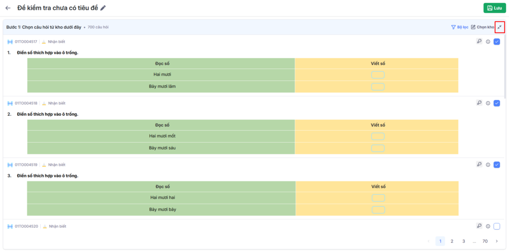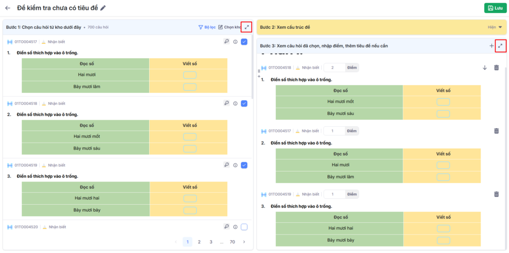Bước 2.7: Giáo viên có thể mở rộng Kho câu hỏi hoặc Danh sách câu hỏi đã chọn để dễ thao tác.