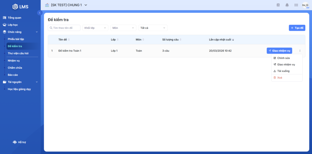 Bước 3: Tại màn hình Đề kiểm tra, giáo viên chọn menu ⋮ để tiến hành Chỉnh sửa nội dung đề, Giao nhiệm vụ, Tải xuống, Xóa đề.