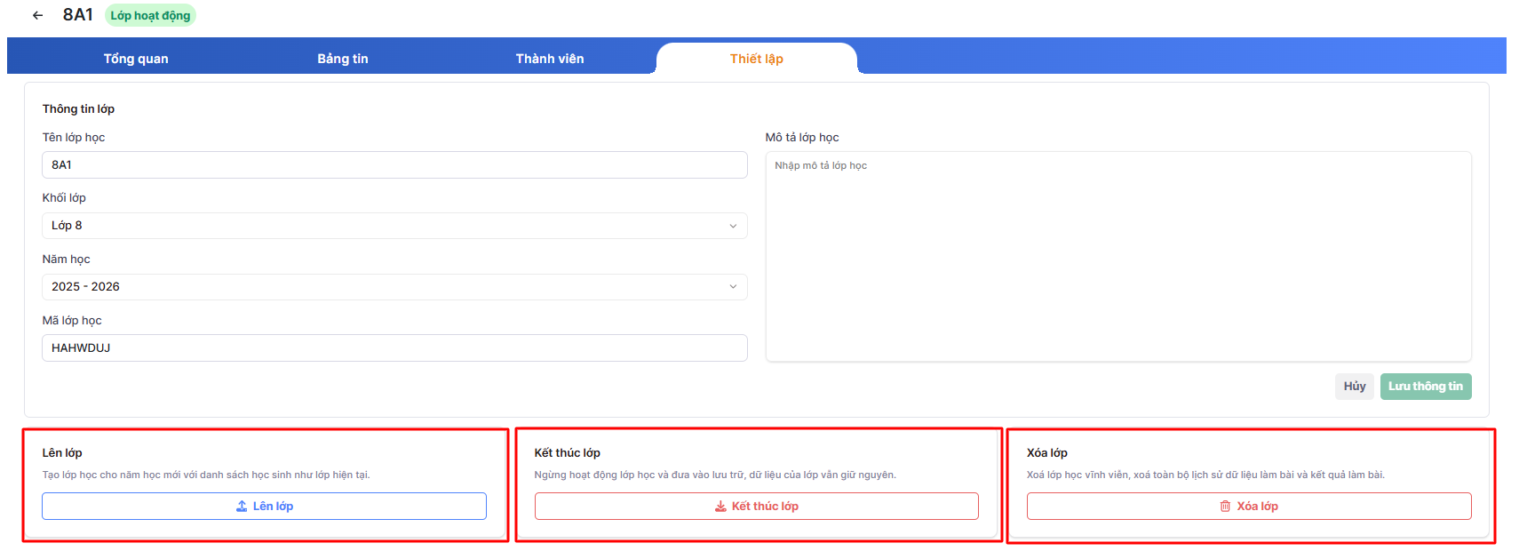Tại màn hình Thiết lập, quản lý trường có thể thực hiện các chức năng Lên lớp, Kết thúc lớp, Xóa lớp.