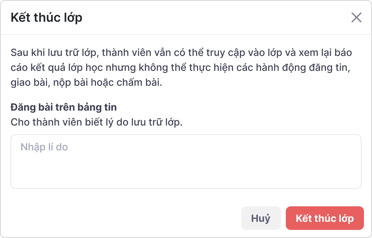 - Kết thúc lớp: Quản lý trường chọn Kết thúc lớp khi muốn lớp học ngừng hoạt động, dữ liệu của lớp học vẫn giữ nguyên. Sau khi thao tác, lớp sẽ được chuyển sang danh sách lớp kết thúc. Giáo viên và học sinh trong lớp vẫn có thể xem các thông tin gồm các báo cáo, danh sách bài tập, bài viết bảng tin, danh sách thành viên nhưng không thể thực hiện được các thao tác như giao bài, làm bài, chấm bài cho lớp.