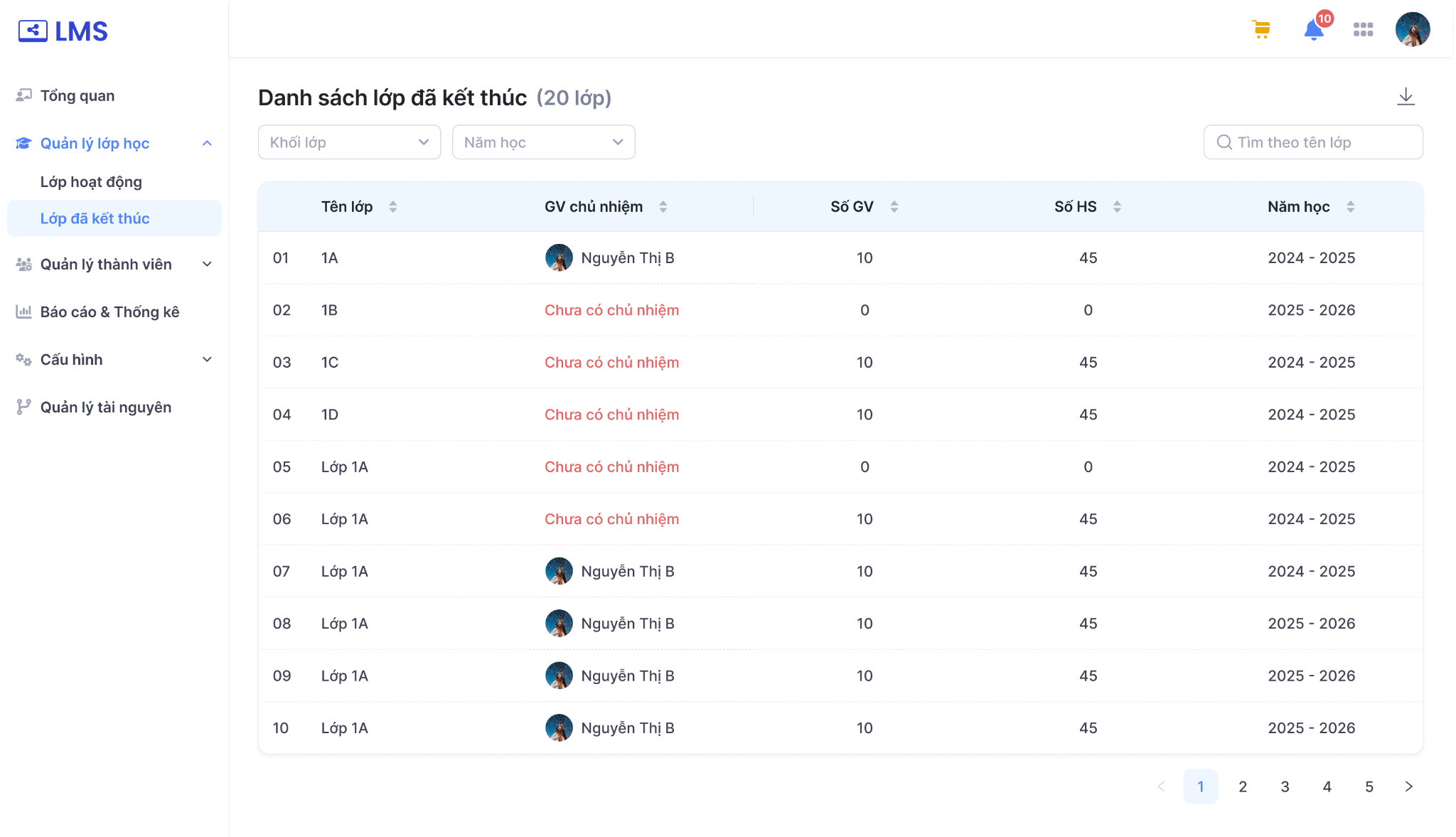 - Xem lại danh sách lớp đã kết thúc: Quản lý trường vào mục Quản lý lớp học > Lớp đã kết thúc.