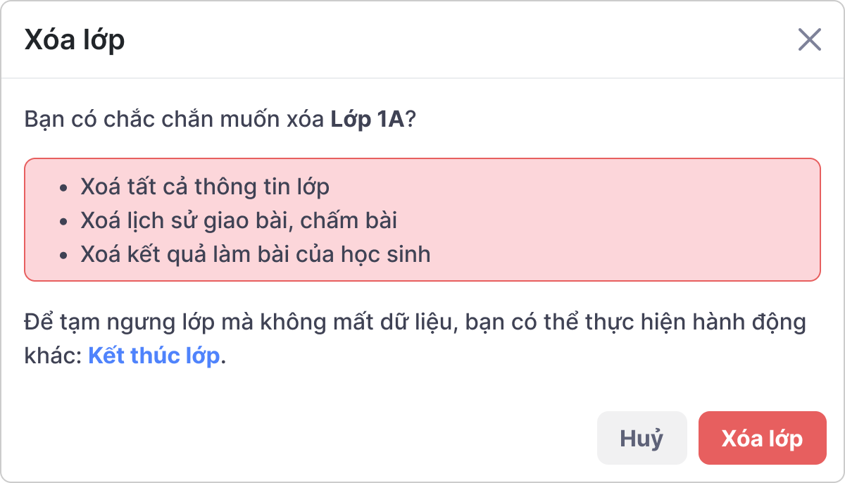 - Xóa lớp: Thầy/Cô chọn Xóa lớp khi muốn xóa lớp học vĩnh viễn, xóa toàn bộ lịch sử dữ liệu làm bài và kết quả làm bài.