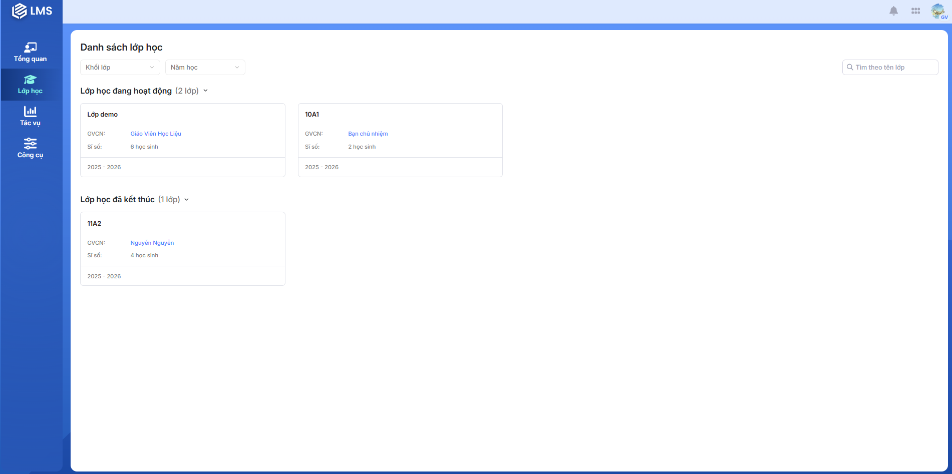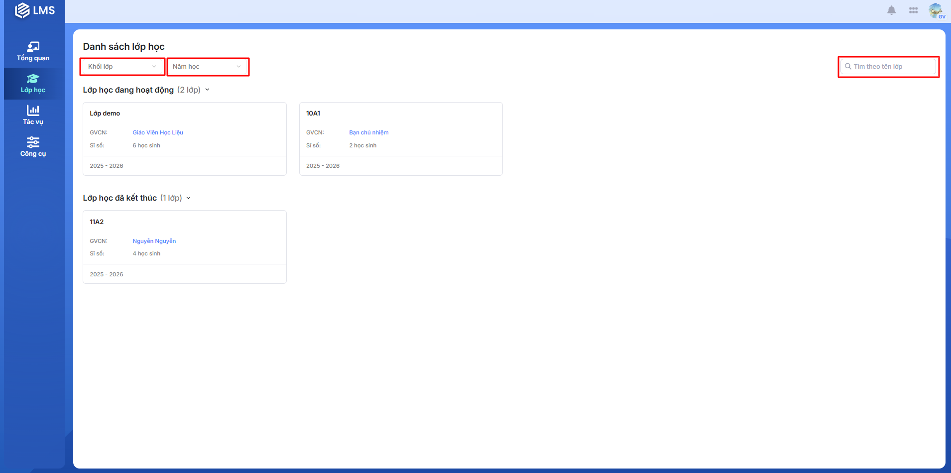 • Khối lớp: Thầy/Cô có thể lọc theo khối lớp.