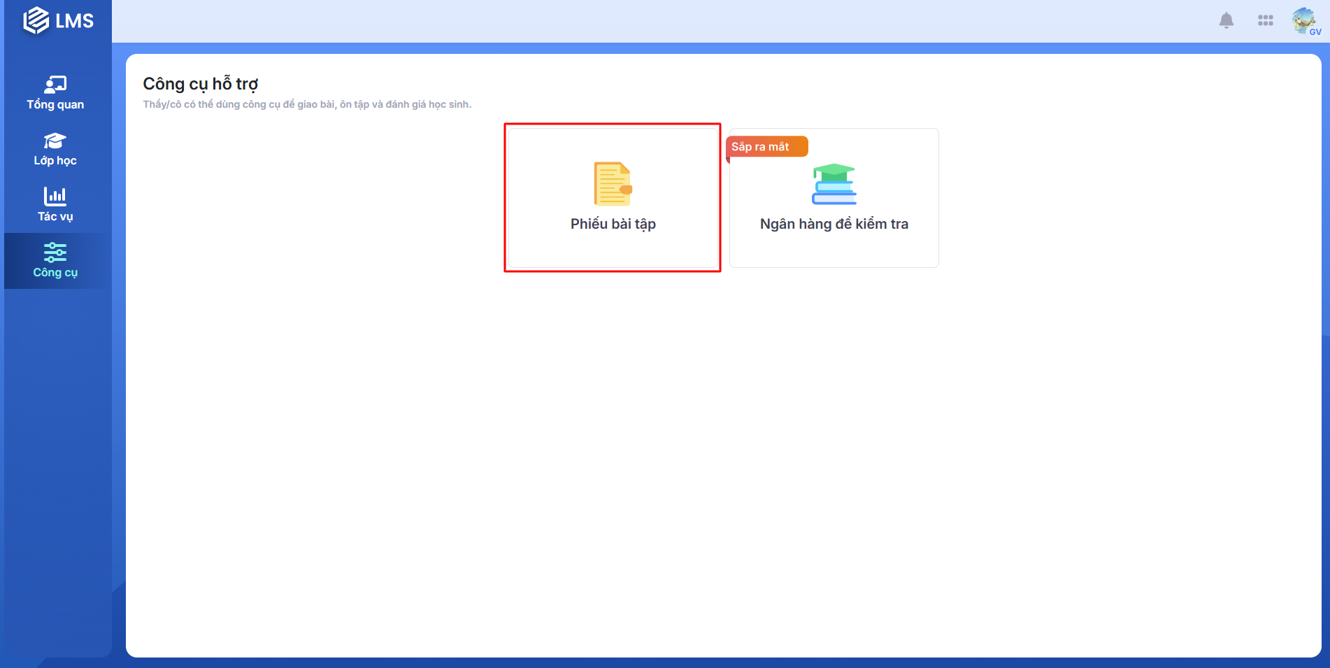Bước 1: Sau khi đăng nhập vào lms.hoclieu.vn, giáo viên chọn mục Công cụ, sau đó chọn Phiếu bài tập