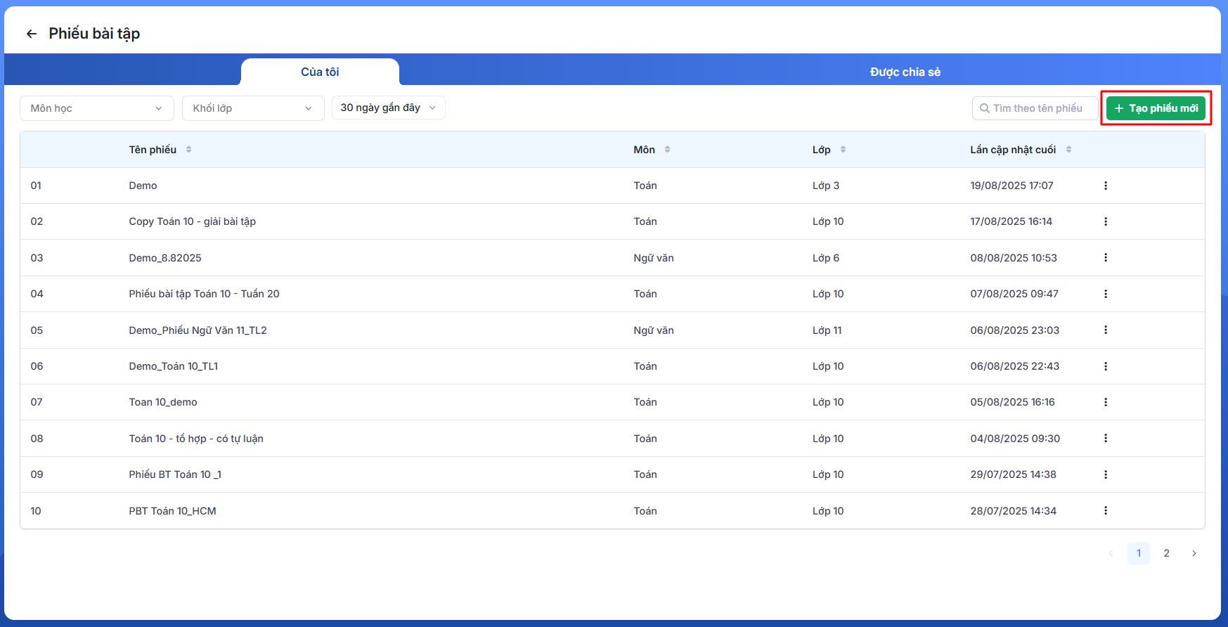 Bước 2: Tại màn hình Phiếu bài tập, giáo viên chọn Tạo phiếu mới để tạo phiếu bài tập