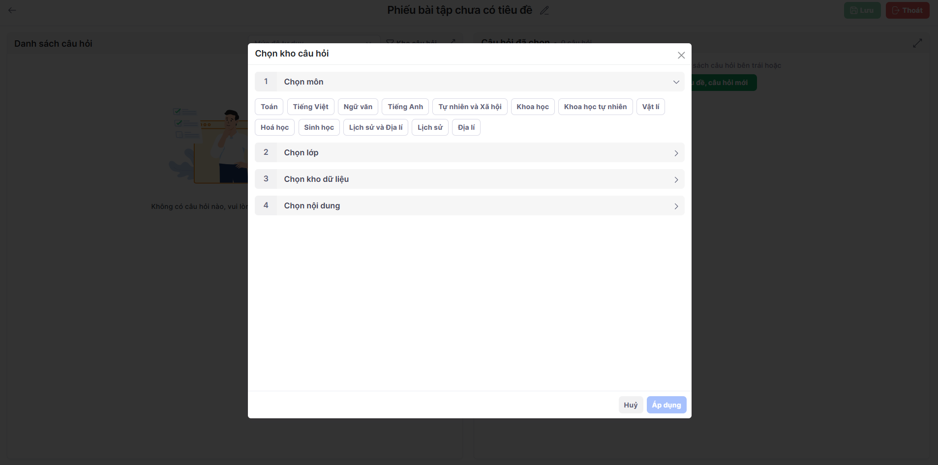 Bước 2.1.5: Sau khi hoàn tất chọn nội dung, giáo viên chọn Áp dụng để hoàn tất chọn kho câu hỏi.