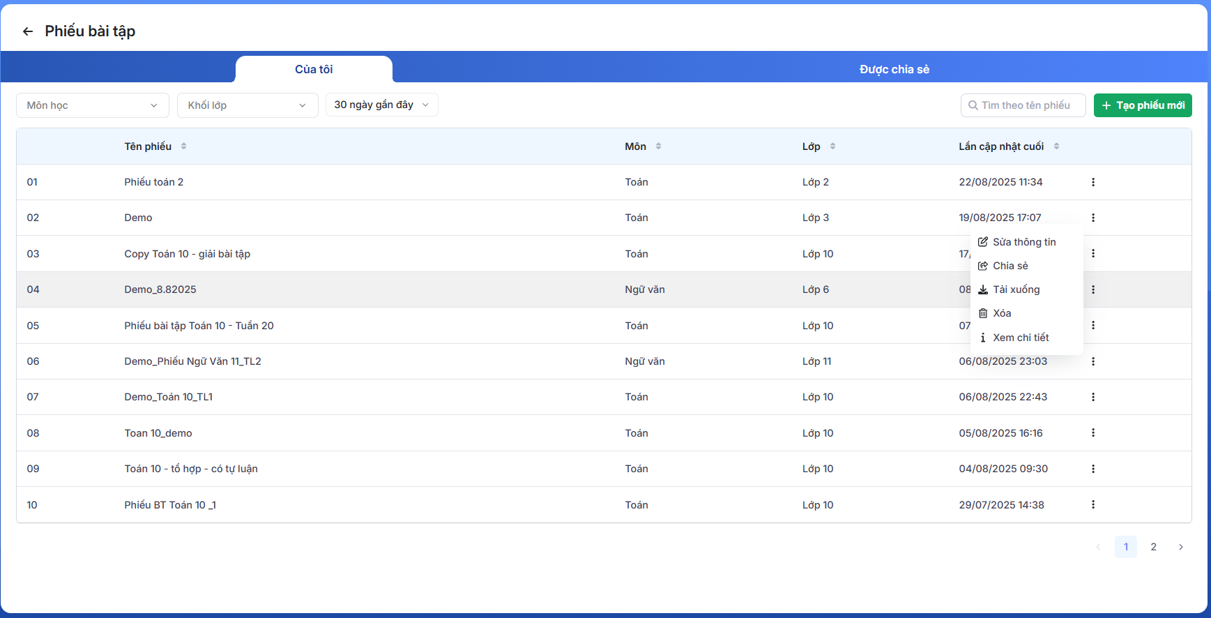 Bước 3: Tại màn hình Phiếu bài tập, giáo viên chọn menu ⋮ để tiến hành Sửa thông tin, Chia sẻ, Tải xuống, Xóa, Xem chi tiết từng phiếu bài tập.